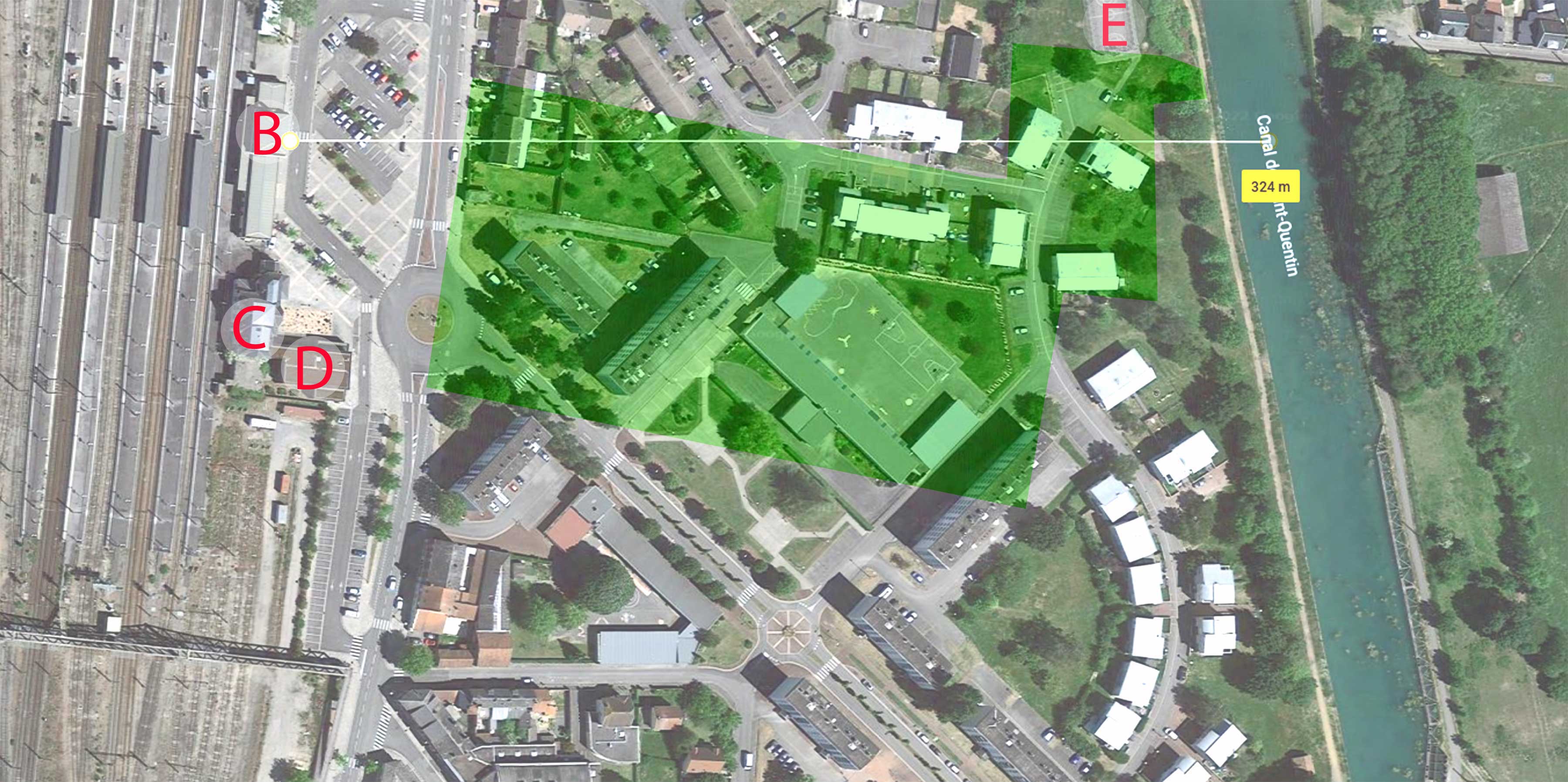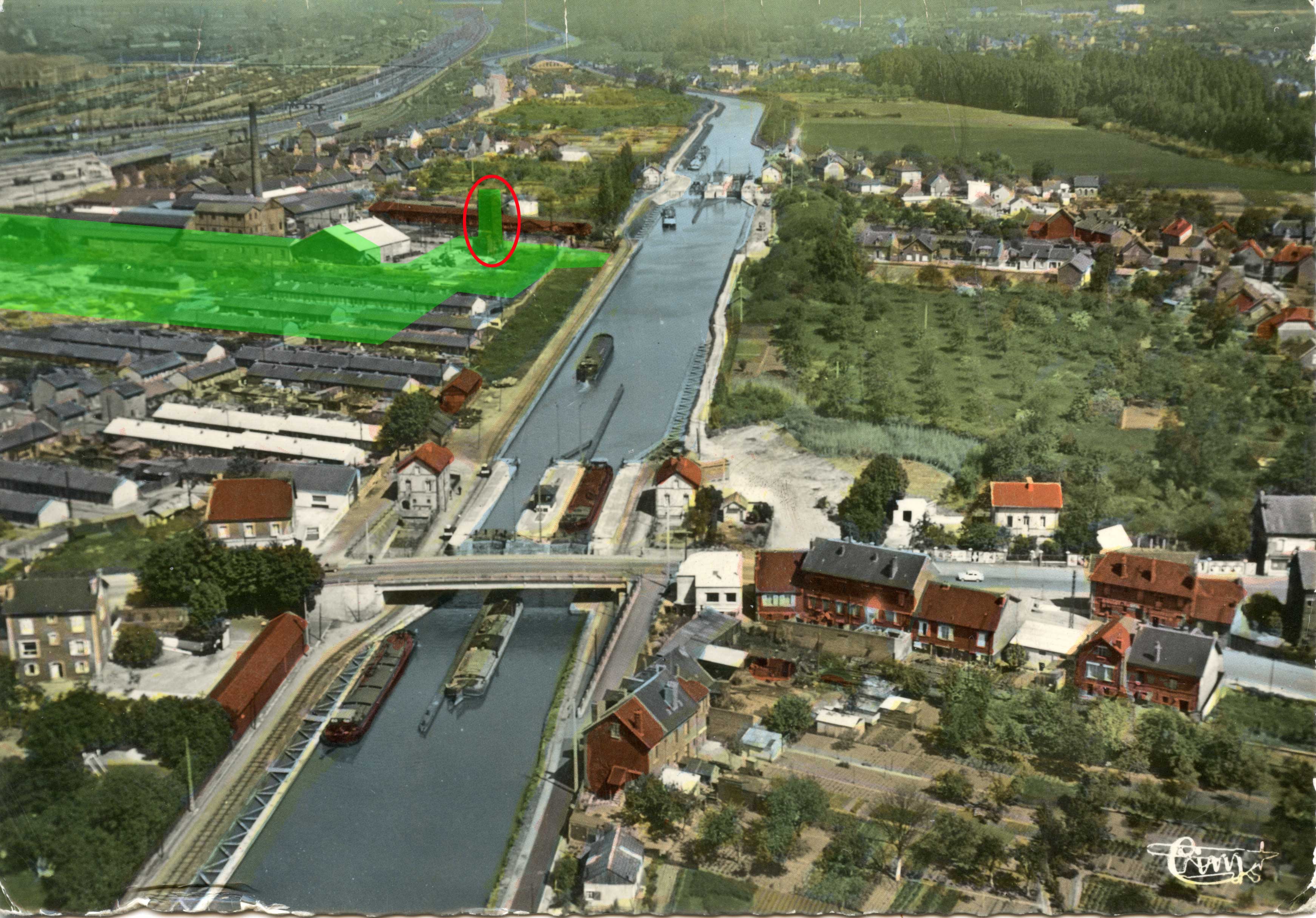 Il n'y a pas beaucoup d'activité industrielle côté canal. Il y a bien une tour (ovale rouge) et