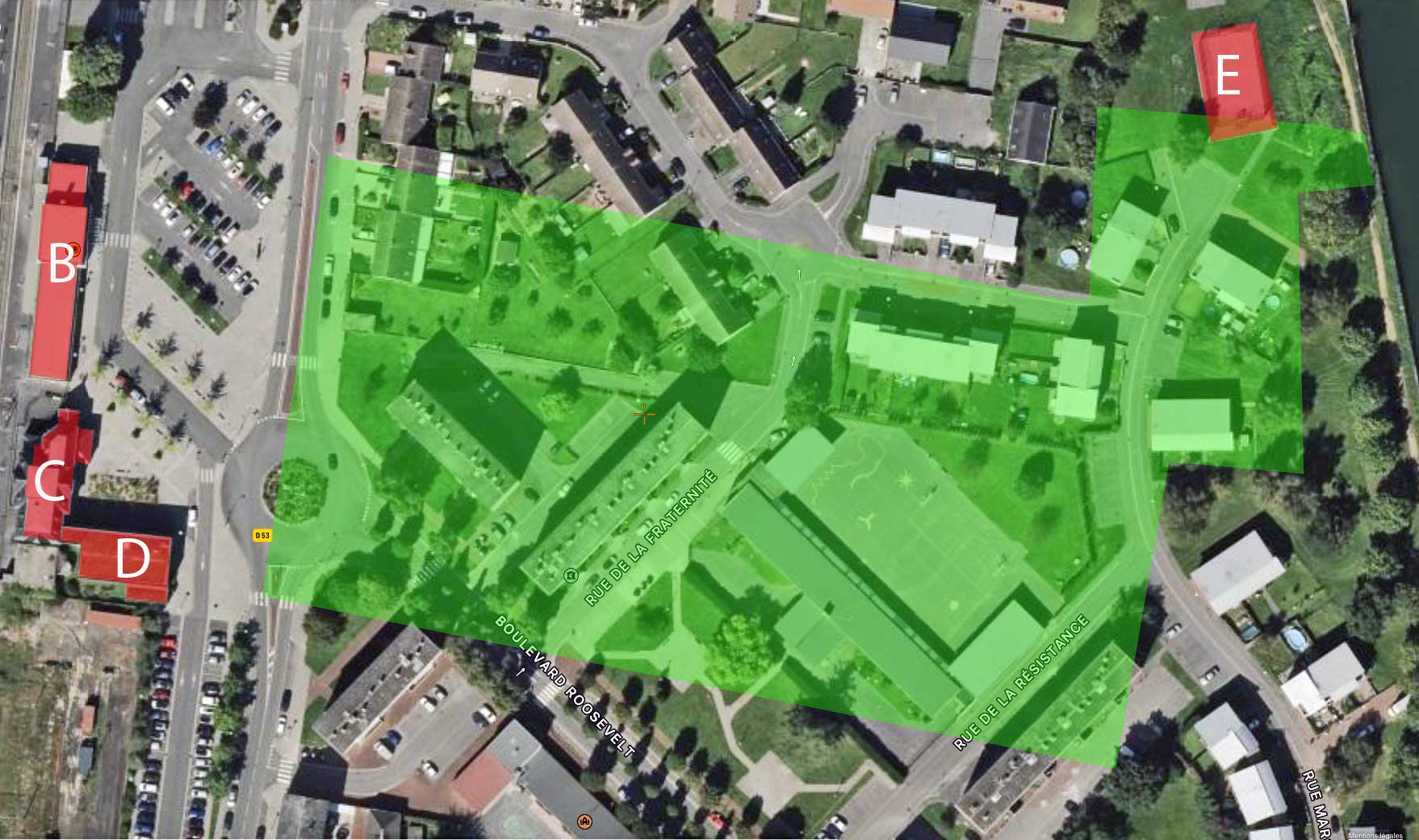 "E" correspond à l'emplacement d'un terrain de basket-ball (point de repère) que l'on peut