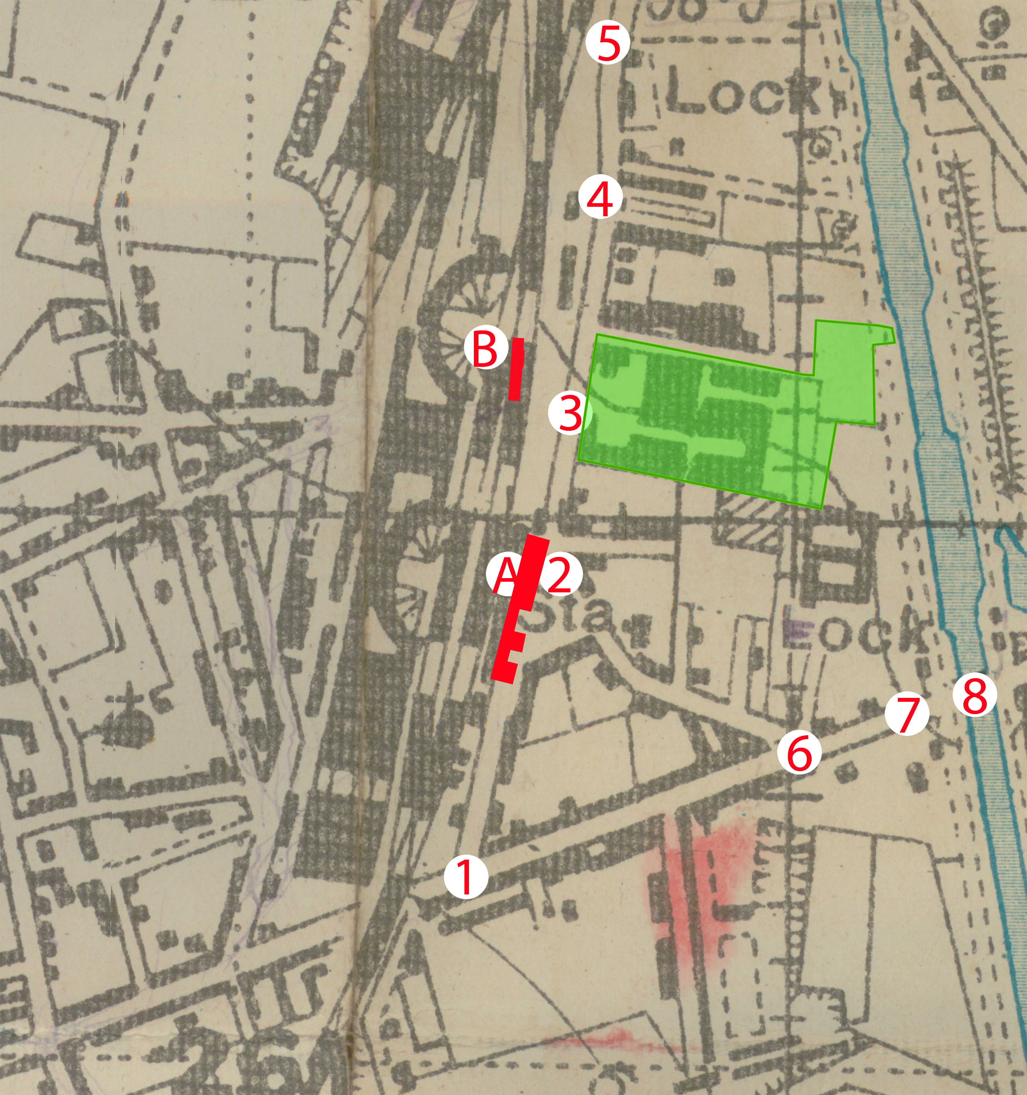 Le grand bâtiment des Entrepôts construit en 1906 le long du canal (ovale rouge) référencé 17