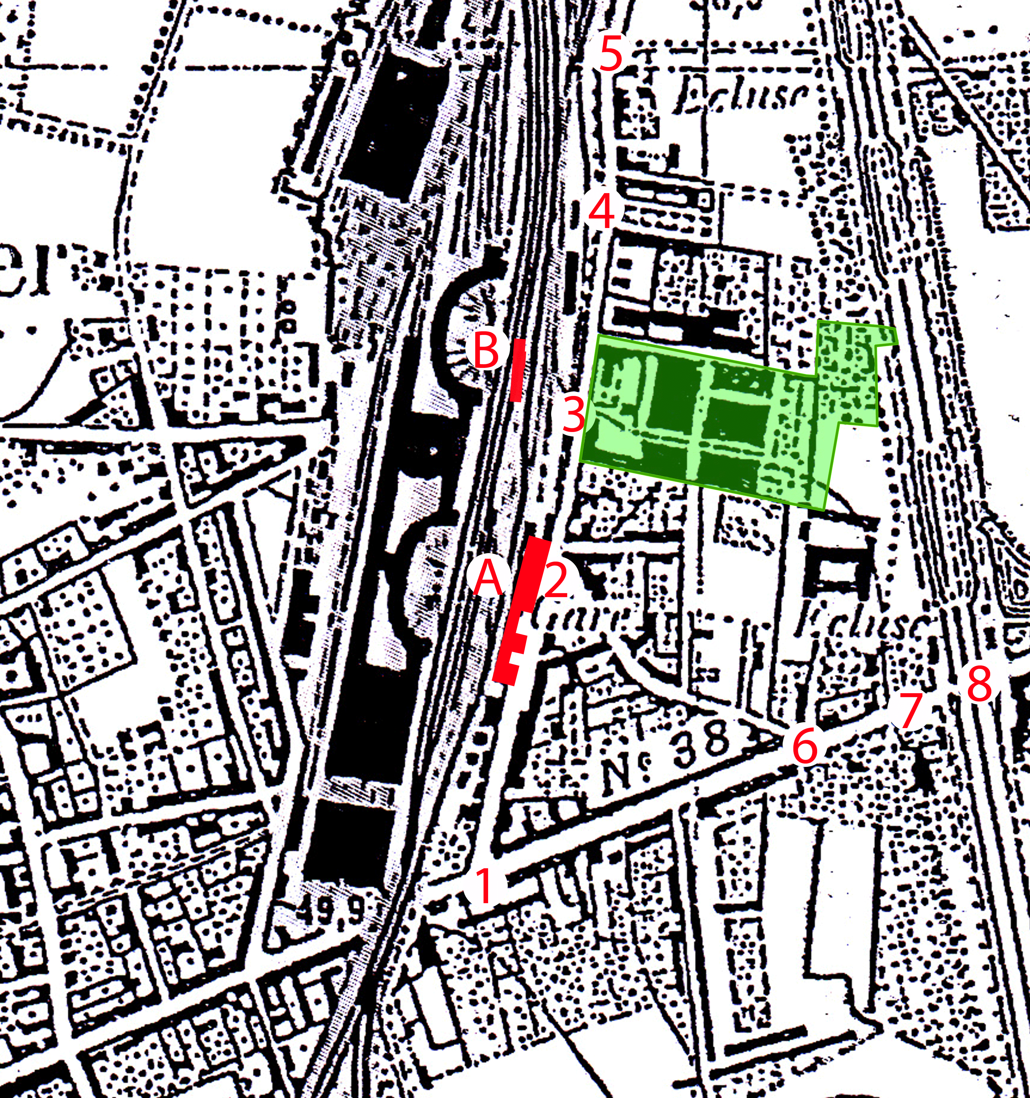Les chiffres (1 - 6 - 7 - 8) représentent le boulevard actuel, à l'époque il s'appelait route