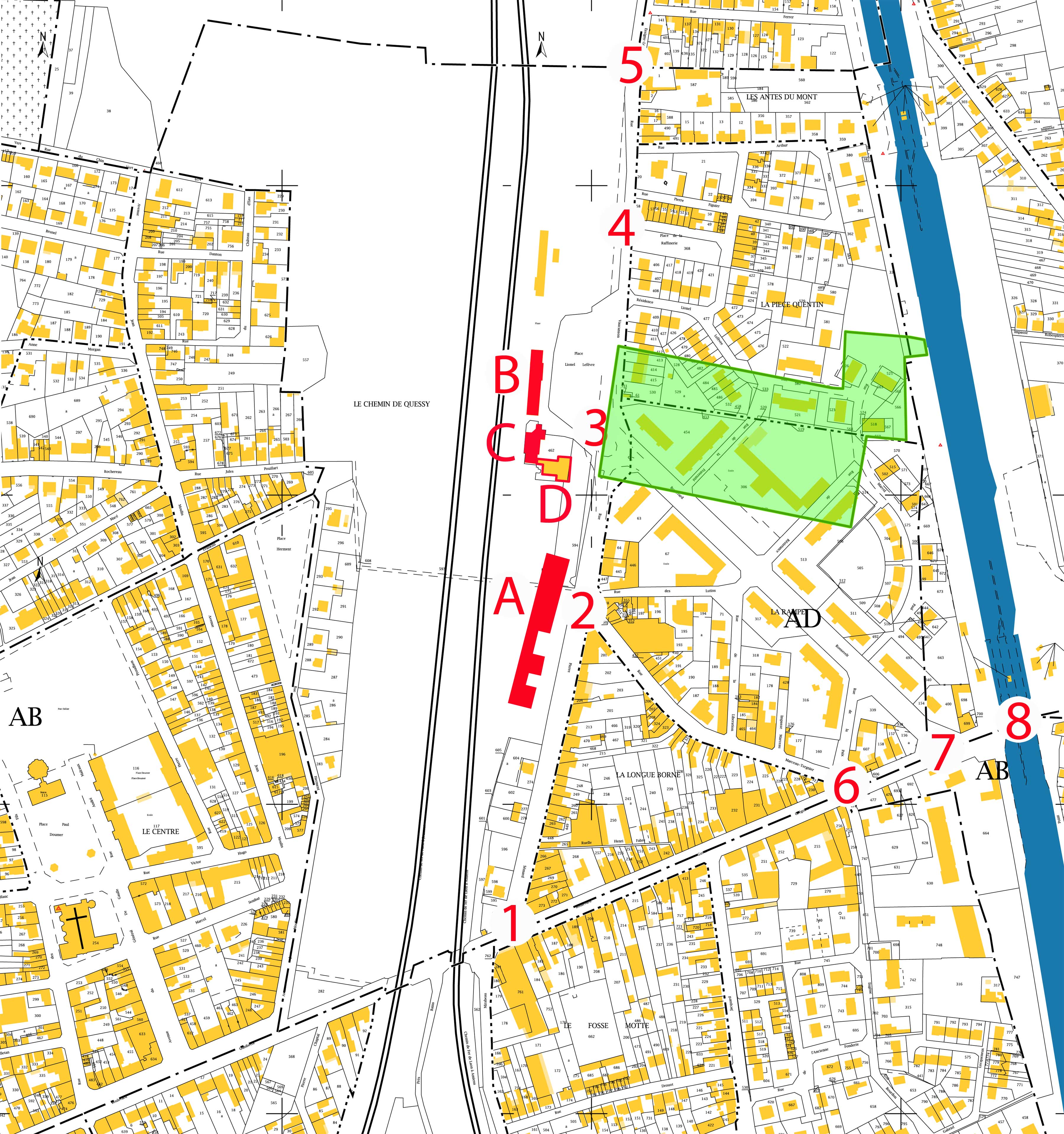 La zone en vert représente l'emplacement de la faïencerie. Sur le terrain qui longe la rue