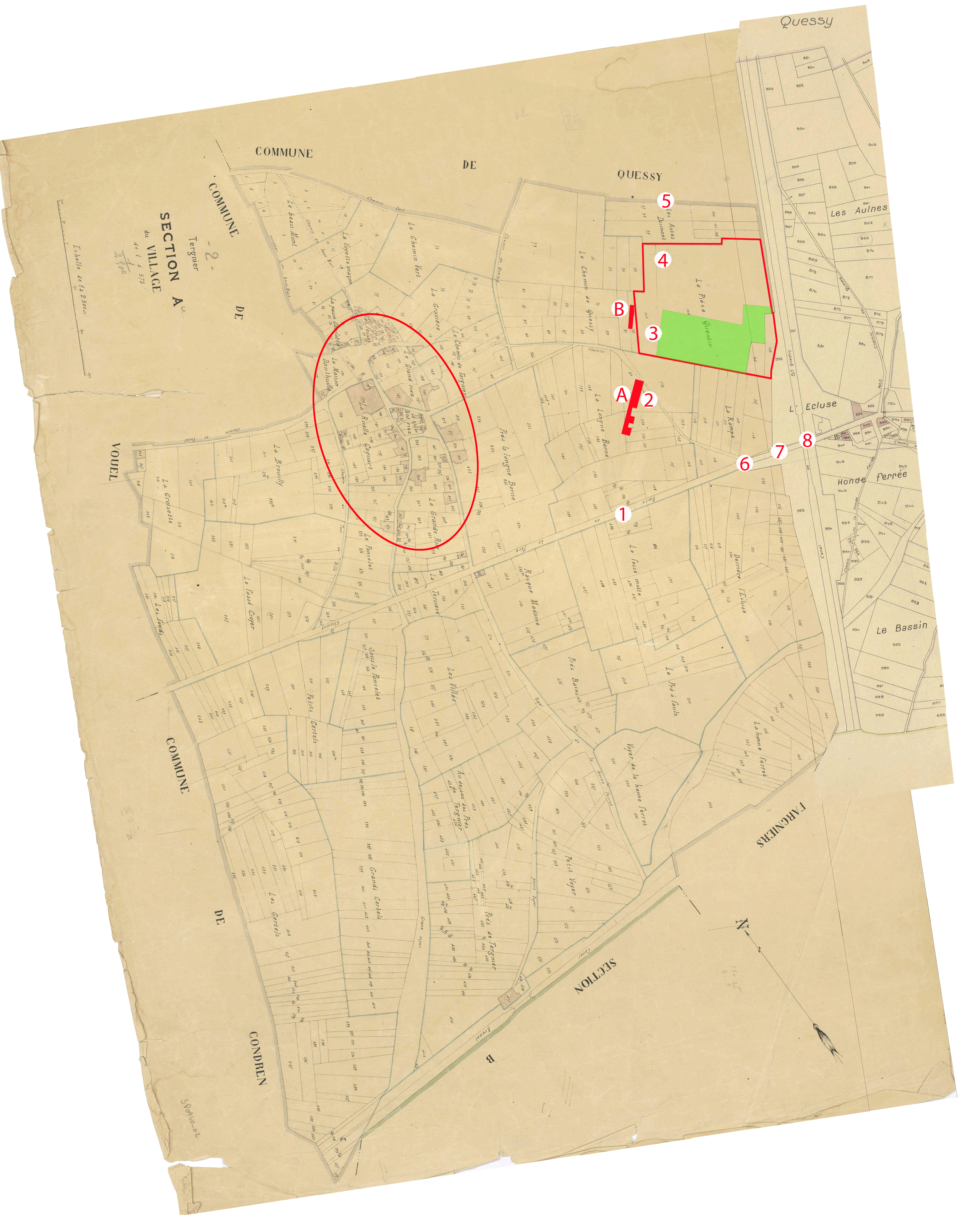 L'ovale rouge représente à peu près l'accès de la faïencerie au quai du halage. Comme on peut